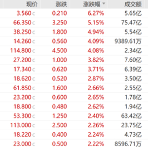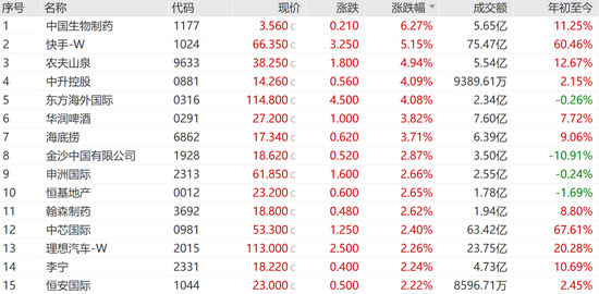 医药、科技及消费股走高,中国生物制药涨6.27%,快手涨5.15%,农夫山泉涨4.94%,领涨蓝筹。