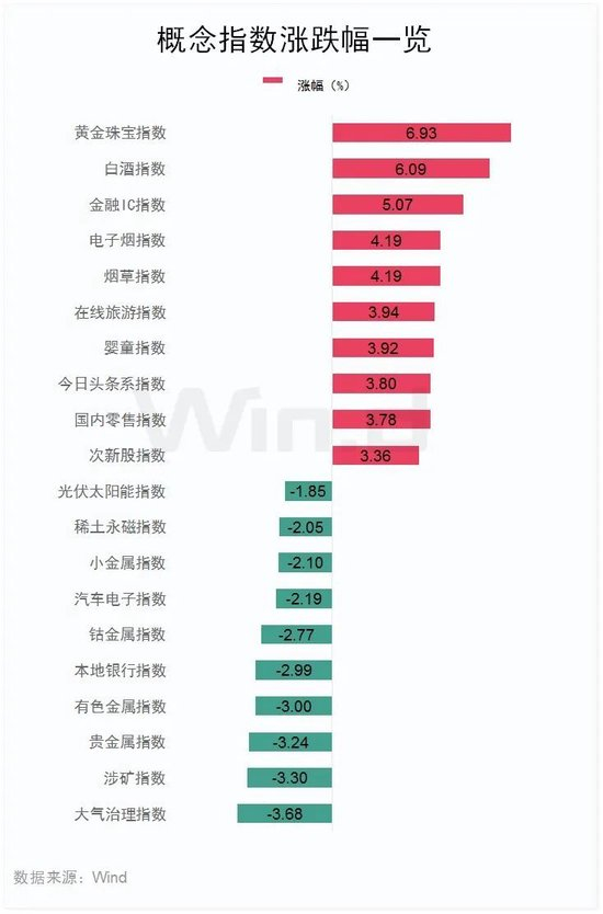 从盘面来看,Wind概念板块多数上涨,黄金珠宝指数涨6.93%,白酒指数涨6.09%,金融IC指数涨5.07%。跌幅方面,大气治理指数领跌3.68%,涉矿指数跌3.3%,贵金属指数跌3.24%。
