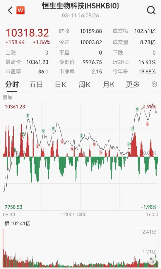 受政策利好刺激,生物科技板块大涨。恒生生物科技指数大涨1.56%。