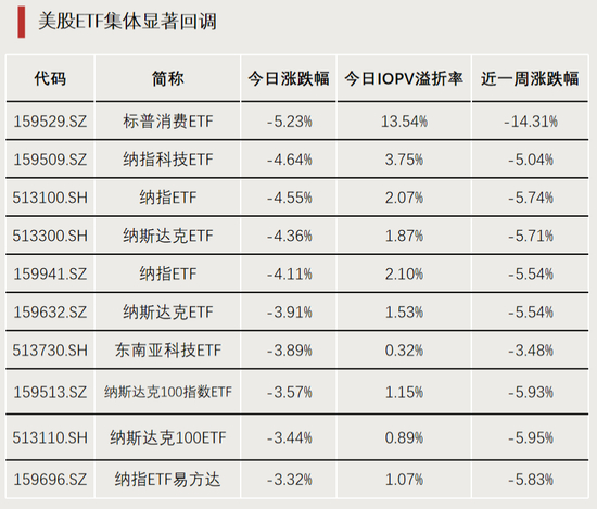 受昨晚美股大跌影响,美股ETF今日集体回调,标普消费ETF(159529)跌超5%,2月以来该ETF累计跌超23%,溢价率由年内高点近53%回落至14%以内;纳指科技ETF(159509)、纳指ETF(513100)等今日也跌超4%。