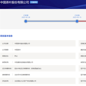 中国茶叶IPO终止!曾于2023年3月收到问询函,但回复迟迟未能挂网,保荐机构为中信建投证券