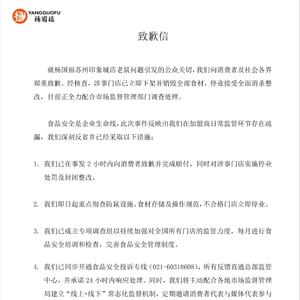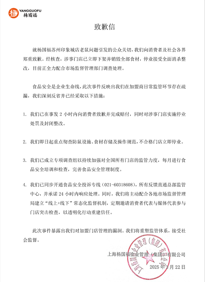 3月22日,杨国福发布致歉信,回应被官方通报苏州印象城店“食品柜出现一老鼠”一事。杨国福表示,经核查,涉事门店已立即下架并销毁全部食材,停业接受全面消杀整改,目前正全力配合市场监督管理部门调查处理。杨国福表示,已在事发2小时内向消费者致歉并完成赔付,同时对涉事门店实施停业胲檉嫌哈玕杯丛罚及封闭整改;即日起重点彻查防鼠设施、食材存储及操作规范,不合格门店立即停业。已成立专项调查组以持续加强对全国所有门店的监管力度,每月进行食品安全培训和检查,完善食品安全管理制度。