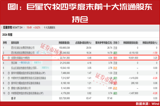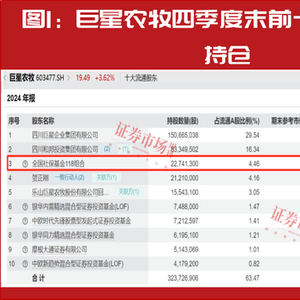 从持股比例的变动情况来看,37家公司被“国家队”资金继续增持或新进重仓,如巨星农牧,2024年四季度末全国社保基金118组合持有公司股份2274.13万股,较三季度末增加了1660.16万股,持股占流通股本的比重提升了3.25个百分点(见图1),从此前的第七大流通股东迅速上升至第三大流通股东。