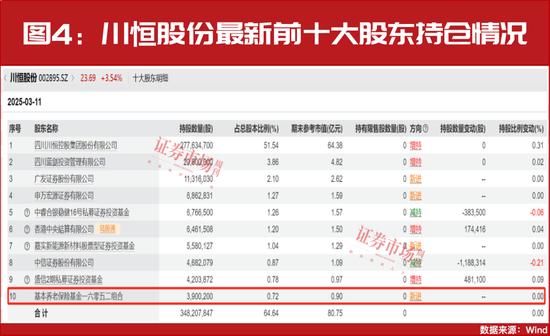 磷化工概念股川恒股份则被基本养老保险基金持续增持,2月25日的大股东持股数显显示,基本养老保险基金一六零五二组合以345.93万股的持仓,新进成为公司第十大股东。3月11日,公司再次更新大股东持仓数据,基本养老保险基金一六零五二组合继续对公司实施了44.09万股的增持,最新持仓股数为390.02万股(见图4)。
