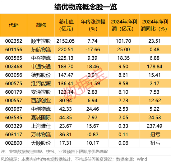 据证券时报·数据宝统计,物流概念股今年以来股价平均上涨4.02%,三羊马、中创物流、海晨股份、原尚股份的涨幅居前,均超20%。三羊马是一家主要通过公铁联运方式为汽车行业和啤酒、饮料、洗涤用品等非汽车行业提供综合服务的第三方物流企业,股价年内涨幅居首,累计上涨27.26%。