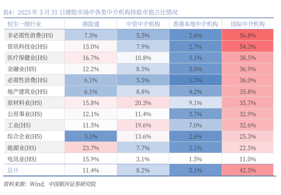 从行业层面来看,截至2025年3月31日,国际中介机构在非必需性消费业、资讯科技业这两个行业中持股市值占比均超过50%,拥有绝对的影响力;在医疗保健业、金融业、必需性消费业、地产建筑业、原材料业、公用事业、工业这7个行业中持股市值占比均超过30%,拥有相对占优的影响力。港股通在能源业、电讯业中持股市值占比分别为23.7%、15.9%,拥有相对占优的影响力。
