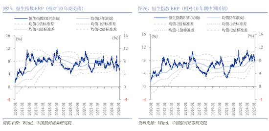 港股行情拆解:(1)2025年以来,港股三大指数领涨全球权益市场。截至3月31日,恒生指数、恒生科技指数、恒生中国企业指数分别较上年末上涨15.25%、20.74%、16.83%。其中,从恒生指数来看,其EPS贡献了2.82%的涨幅,其PE估值贡献了12.1%的涨幅;从恒生科技指数来看,其EPS贡献了11.29%的涨幅,PE估值贡献了8.49%的涨幅。(2)从绝对估值来看,港股仍然低于美股;从相对估值来看,恒生科技的PE估值仍然处于历史中低水平。截至3月31日,恒生指数的PE、PB分别为10.29倍、1.1倍,分别处于2019年以来65%、69%分位数水平。恒生科技指数的PE、PB分别为22.4倍、3.05倍,分别处于2019年以来20%、62%分位数水平。(3)2025年3月31日,10年期美国国债到期收益率为4.23%,港股恒生指数的风险溢价率为5.49%,为3年滚动均值-1.7倍标准差,处于2010年以来15%分位。