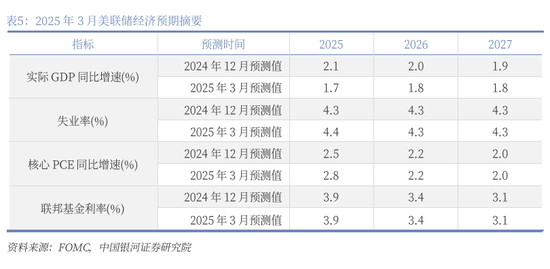 美联储大幅下调2025年经济增长预期,同时上调通胀预期、上调失业率预期,表明美国经济不确定性上升。美联储FOMC经济预期显示,2025年GDP增速预期中值为1.7%,去年12月预期为2.1%;2025核心PCE通胀预期中值2.8%,去年12月预期为2.5%;2025失业率预期中值4.4%,去年12月预期为4.3%。鲍威尔表示,美国经济总体强劲,调查显示经济不确定性加剧。美国经济衰退的可能性有所上升,但并不高。市场信心大幅下滑,但经济活动尚且没有。