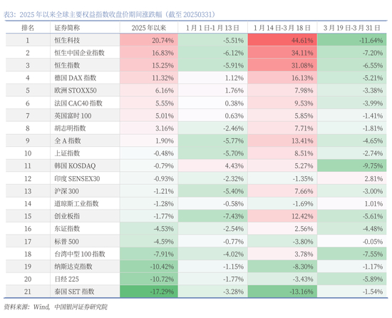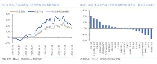 2025年以来,港股三大指数领涨全球权益市场。截至3月31日,恒生指数、恒生科技指数、恒生中国企业指数分别较上年末上涨15.25%、20.74%、16.83%。