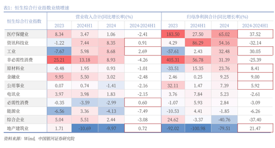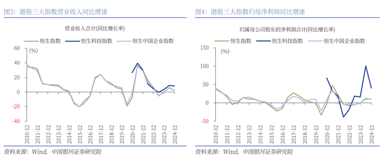 从恒生综合行业指数来看,2024年8个行业营收同比正增长,9个行业归母净利润同比正增长。其中,非必需性消费、资讯科技业、工业的营收同比增速均超过8%,归母净利润同比增速均超过30%,若考虑基数效应的影响,则非必需性消费业业绩增速最高,其次是资讯科技业。2024年,金融业、电讯业、医疗保健业、原材料业的营收同比小幅正增长,归母净利润也实现同比正增长。公用事业、必需性消费业、能源业、地产建筑业营收同比负增长,其中公用事业、必需性消费业归母净利润实现了正增长,而能源业、地产建筑业的归母净利润同比负增长,业绩压力较大。
