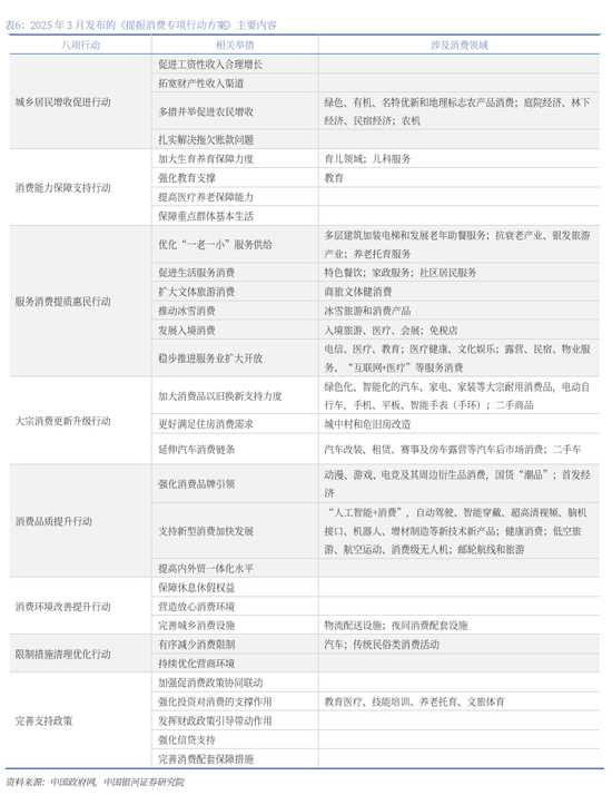 今年的政府工作报告指出“出台实施政策要能早则早、宁早勿晚”,而提振消费是今年政府工作的首要任务。2025年3月5日,十四届全国人大三次会议举行开幕会,国务院总理李强代表国务院,作政府工作报告。2025年政府全年经济社会发展工作任务中,“大力提振消费、提高投资效益,全方位扩大国内需求”被放在第一位,突出了政策层面对于扩大内需的高度重视。消费方面,政府工作报告强调将“实施提振消费专项行动”,供给端增加优质供给,需求端促进居民增收,安排超长期特别国债3000亿元支持消费品以旧换新。重点提到的领域有:健康、养老、托幼、家政等多元化消费,数字、绿色、智能等新型消费,文化、旅游、体育等消费,免税店和入境消费。