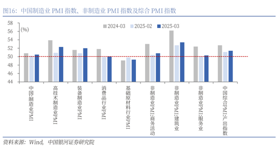 总体上来看,2025年一季度,政策支持力度较大的行业景气度明显更高,即“两新”领域和高技术行业,其生产需求均呈扩张状态。展望后市,一方面,政策效果将继续显现,且有望间接带动其他行业。另一方面,还需要关注美国关税政策对中国经济的影响。