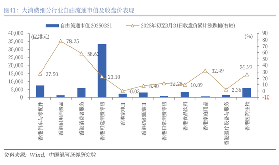 从消费行业指数来看,自由流通市值最大板块,即可选消费零售行业,2025年一季度收盘价累计上涨了23.1%;其次,自由流通市值较大的汽车与零配件、消费者服务、医药生物分别上涨27.5%、58.63%、26.27%;而自由流通市值较小的耐用消费品、家庭用品分别上涨78.25%、32.49%。