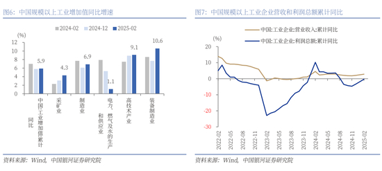 2025年1-2月份,规模以上工业增加值同比实际增长5.9%,增速比上年全年加快0.1个百分点。从环比看,2月份,规模以上工业增加值比上月增长0.51%。分三大门类看,1-2月份,采矿业增加值同比增长4.3%,制造业增长6.9%,电力、热力、燃气及水生产和供应业增长1.1%。制造业中,1-2月份,装备制造业增加值同比增长10.6%,对工业增长支撑作用非常明显;高技术制造业增加值同比增长9.1%,比上年全年加快0.2个百分点。
