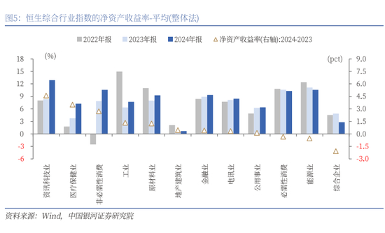 从盈利能力来看,2024年,资讯科技业、能源业、非必需性消费、必需性消费的净资产收益率(平均)均超10%。2024年,恒生综合行业指数中9个行业的净资产收益率(平均)较2023年上升,其中,资讯科技业、医疗保健业、非必需性消费、工业、原材料业的涨幅均超1pct。