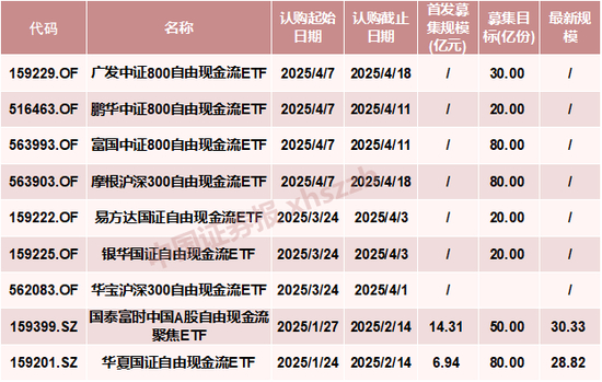 根据Wind统计的数据,此前,已有易方达国证自由现金流ETF、银华国证自由现金流ETF、华宝沪深300自由现金流ETF、华夏国证自由现金流ETF、国泰富时中国A股自由现金流聚焦ETF等多只产品完成募集。