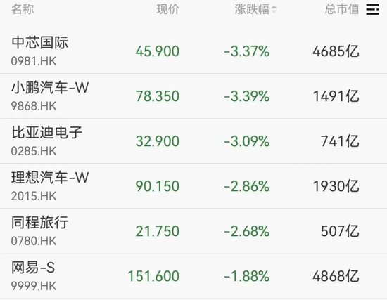 港股方面,三大指数涨跌不一,恒生科技指数跌超1%,中芯国际、小鹏汽车、比亚迪电子均跌超3%。