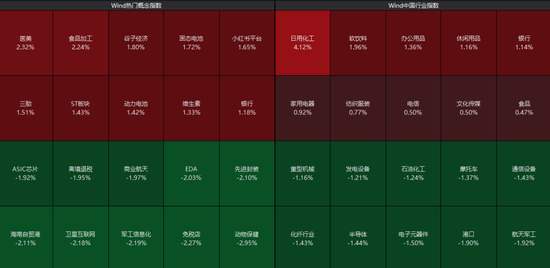 板块上看,大消费板块持续走强,食品、乳业、美容等方向表现活跃,固态电池、银行、文化传媒等板块震荡拉升;而航天军工、半导体、通信设备等板块跌幅居前。