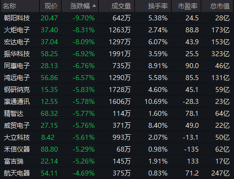 此外,电子元器件板块震荡下探,朝阳科技、火炬电子、宏达电子等多股跌超7%。