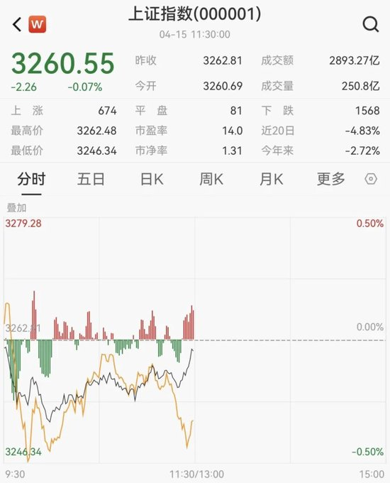 4月15日上午,A股市场震荡调整。截至午间收盘,沪指跌0.07%,深成指跌0.43%,创业板指跌0.29%。