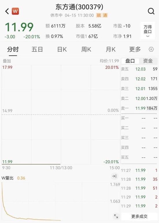 4月15日,东方通开盘20CM跌停,184万手封住跌停板。截至午间收盘,该股报11.99元/股,总市值为67亿元。