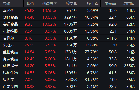 大消费板块持续走强,食品股异动拉升,劲仔食品、安记食品、京粮控股、麦趣尔等涨停。