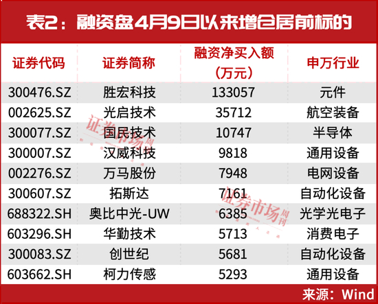 另外,光启技术、国民技术、汉威科技、万马股份、拓斯达等也在4月9日以来获得融资盘大笔增仓(见表2)。