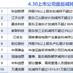 据统计,4月30日,暂无A股上市公司披露增持情况。包括科创新源、江天化学、赢合科技、家联科技、江波龙、凯伦股份恒锋信息中国黄金、中科信息、万通发展在内的10家A股上市公司披露减持情况。