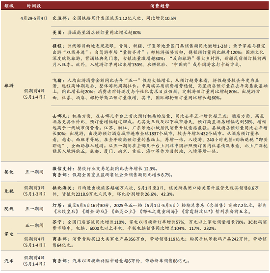 据商务部,五一假期全国重点零售和餐饮企业销售额同比增长6.3%,增速相较24年国庆(4.5%)、25年春节(5.4%)呈环比提速;各省市及线上平台发布的消费数据显示,长线游、出入境游均有亮眼表现,同时品类上以旧换新备受欢迎,演唱会、潮玩等体验型消费亦表现较好。展望后续,我们继续看好消费提振政策逐步显效,全年居民消费需求持续释放。