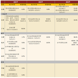 1、五一期间商圈客流及消费延续回暖。根据各省市数据,高线城市重点商圈客流较火热,北京60个重点商圈(+8.3%)、上海35个重点商圈(+12.9%)、长沙五一商圈(峰值+22.2%)同比增幅明显,显示假期外出客流及消费意愿高涨。消费意愿方面,5月1至5日境内微信支付总消费订单同增10%,显示出较好的消费热情。分地区看,根据各省市商务局披露,南京、上海、杭州等重点旅游城市消费数据(具体口径详见下方图表)分别同增8.7%/13.1%/9.0%。