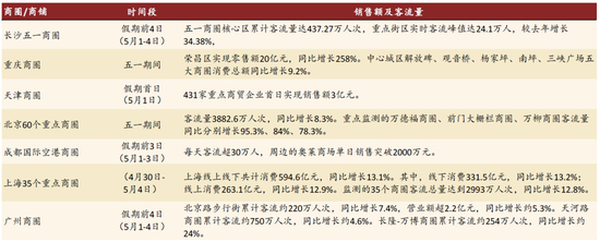 3、以旧换新品类延续较好势头,演唱会、潮玩等体验型消费表现亮眼。假期期间,商务部重点监测零售企业家电、汽车、通讯器材销售额同比分别增长15.5%、13.7%和10.5%,重点监测电商平台智能家居产品销售额同比增长超20%。此外,美团数据显示“五一”期间全国5000人以上大型演出超百场,观众人数超200万人次,上海、成都等地通过 “票根经济”等模式延长消费链条,提升消费黏性。同时,以潮玩为代表的新消费备受瞩目,如上海南京路泡泡玛特、卡牌龙头旗舰店、百联ZX创趣场等门店节日期间吸引大量消费者驻足,进一步展示潮玩相关等悦己消费的潜力。