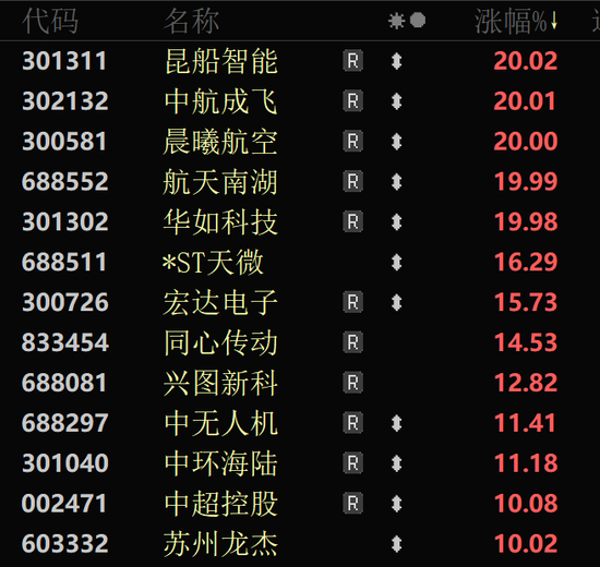 市场热点方面,军工股延续上周强势,继续放量上攻,地面兵装板块指数创近3年来新高,军工电子、航空装备等也纷纷创出年内新高。中航成飞、晨曦航空、航天南湖、华如科技等多股20%涨停,雷科防务、天箭科技、成飞集成等亦批量封板。