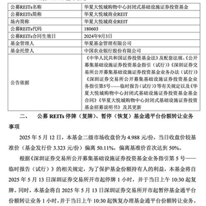 5月13日,华夏基金发布旗下华夏大悦城商业REIT停复牌、暂停恢复基金通平台份额转让业务及交易情况提示公告。