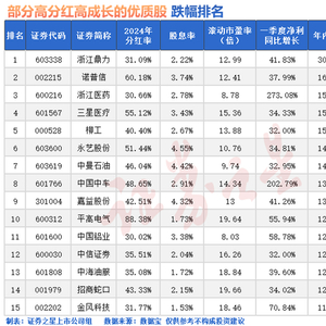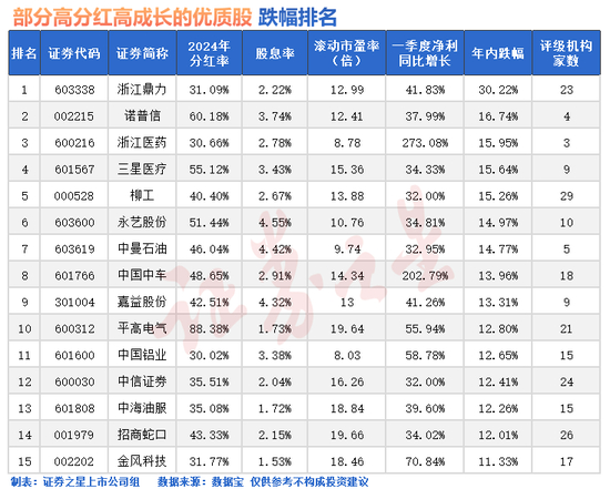 据统计,3家及以上机构评级个股中,2024年分红率30%以上、2025年一季度净利同比增长超30%、滚动市盈率20倍以下、年内跌幅超10%的个股共有15只。