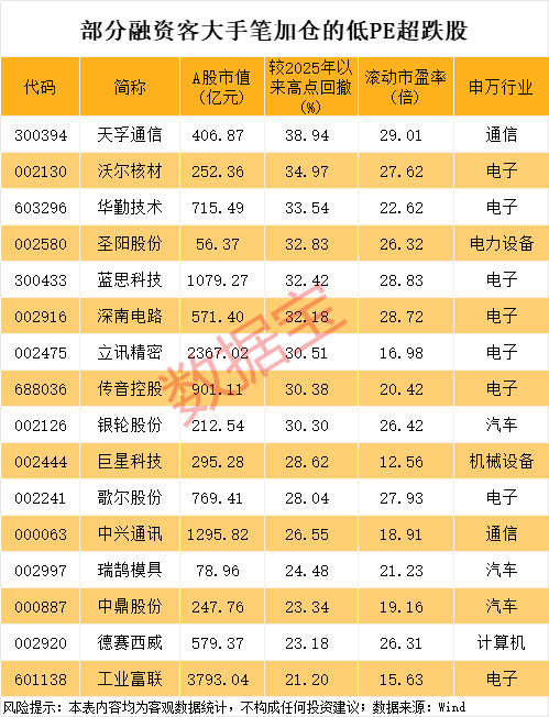 这些低市盈率的股票中,已有多只股票处于超跌状态。数据宝统计,以5月15日收盘价与年内高点相比,16股回撤幅度超20%。4只市值超千亿元的行业龙头股名列其中,分别是工业富联、立讯精密、中兴通讯、蓝思科技。