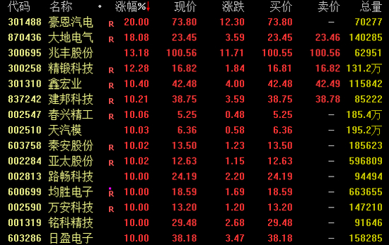 汽车产业链股盘中强势拉升,截至收盘,豪恩汽电20%涨停,大地电气涨超18%,春兴精工、天汽模、亚太股份、路畅科技、万安科技等均涨停。
