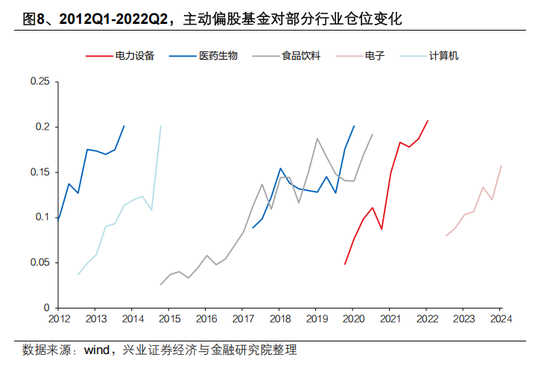 回到国内,主动权益基金更善于捕捉新产业趋势且敢于重仓高景气行业。2012-2021年,中国总量经济增速温和,但其中涌现了大量优秀产业和对应的α机遇,包括移动互联网、消费升级、老龄化和高端制造业等。挖掘、重仓产业趋势对应的高景气行业是主动基金长期跑赢的根本。