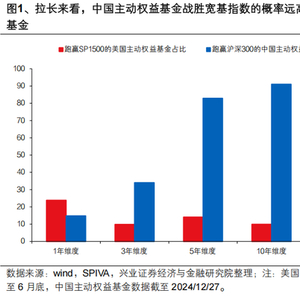 中美主动投资最重要的差异在于,美国主动权益基金长期难以战胜指数,久期越长越容易跑输;而中国主动基金随着时间久期越长,跑赢指数的比例越高。