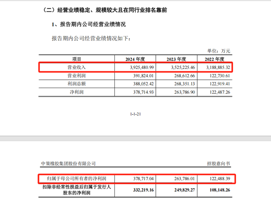 2022年至2024年,中策橡胶的营业收入分别为318.89亿元、352.52亿元、392.55亿元,归母净利润分别为12.25亿元、26.38亿元、37.87亿元。