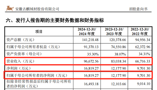 2022年至2024年,古麒绒材的营业收入分别为6.67亿元、8.30亿元、9.67亿元,归母净利润分别为9701.30万元、1.22亿元、1.68亿元。