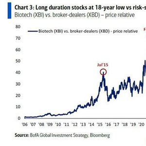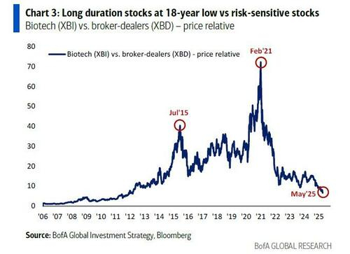 Hartnett还指出,长期生物技术股(XBI)相对于风险看多的券商股(XBD)跌至2007年10月以来的最低水平。Hartnet认为,这证实了市场对任何有期限投资的恐惧和厌恶,“除了债券都要”(ABB)的共识依然根深蒂固。