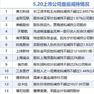 5月20日增减持汇总:暂无增持 美力科技等13股减持(表)