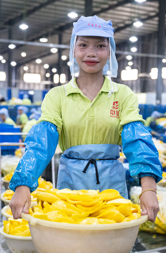 2025年3月18日,在柬埔寨磅士卑省尖山县中国福建省中宝食品科技有限公司投资建设的芒果干加工厂,一名工人展示她刚削出来的芒果。得益于中企引入的标准、经验和先进生产线,柬埔寨芒果在国际市场上的名声越来越大。