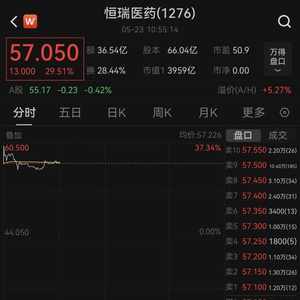 5月23日,继宁德时代之后,A股医药巨头恒瑞医药(600276.SH/01276.HK)正式登陆港交所。上市前夕(5月22日),其暗盘交易已大涨超30%,引发市场高度关注。今日早盘,恒瑞医药高开29.4%,报57港元/股,其发行价为44.05港元/股。开盘后,恒瑞医药涨幅一度超过37%,随后有所回落,截至记者发稿,恒瑞医药涨幅接近30%。