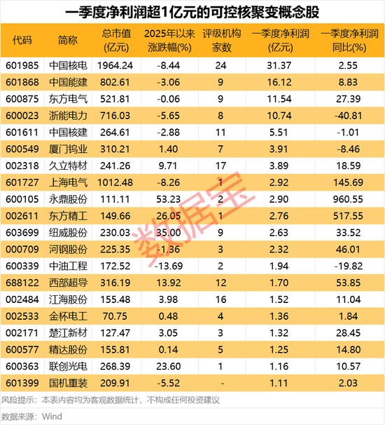 证券时报·数据宝梳理了今年一季度净利润超1亿元的可控核聚变概念股,共计20只。从净利润规模来看,中国核电、中国能建、东方电气、浙能电力今年一季度净利润规模居前,分别为31.37亿元、16.12亿元、11.54亿元、10.74亿元。
