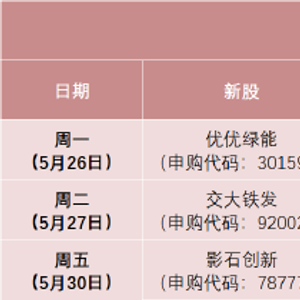 日程安排上,周一(5月26日)可申购创业板新股优优绿能,周二(5月27日)可申购北交所新股交大铁发,周五(5月30日)可申购科创板新股影石创新。