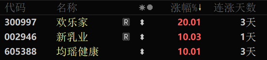 食品饮料行业全线上涨,饮料乳品方向领涨,板块指数放量涨逾3%,创3年半来新高。欢乐家20cm涨停;均瑶健康一字涨停,连续第3日封板;新乳业亦强势涨停,股价创4年多来新高。