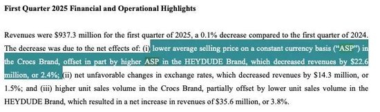 卡骆驰集团2025年一季度财报显示,Crocs平均售价下降2.4%。或许也契合上述现象,年轻人仍愿意在鞋服上花钱,但对高溢价的联名款、鞋花等兴趣消退——但这恰恰是Crocs品牌内核的载体。