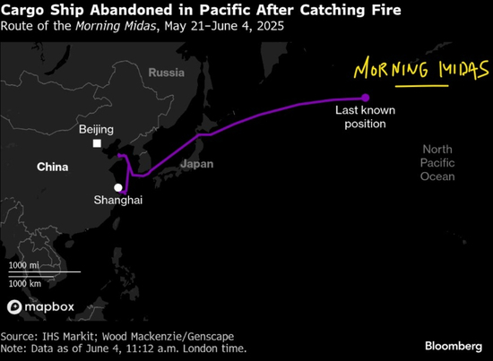 起火原因尚不明确,是否与车载电池有关仍待调查,船上具体品牌和车型也未披露。但据MarineTraffic等船舶追踪数据显示,Morning Midas号在5月26日从山东烟台启航,准备运往墨西哥太平洋主要港口拉萨罗卡德纳斯。
