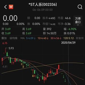 *ST人乐于4月30日停牌。4月29日收盘,*ST人乐报3.69元/股,总市值为16.2亿元。